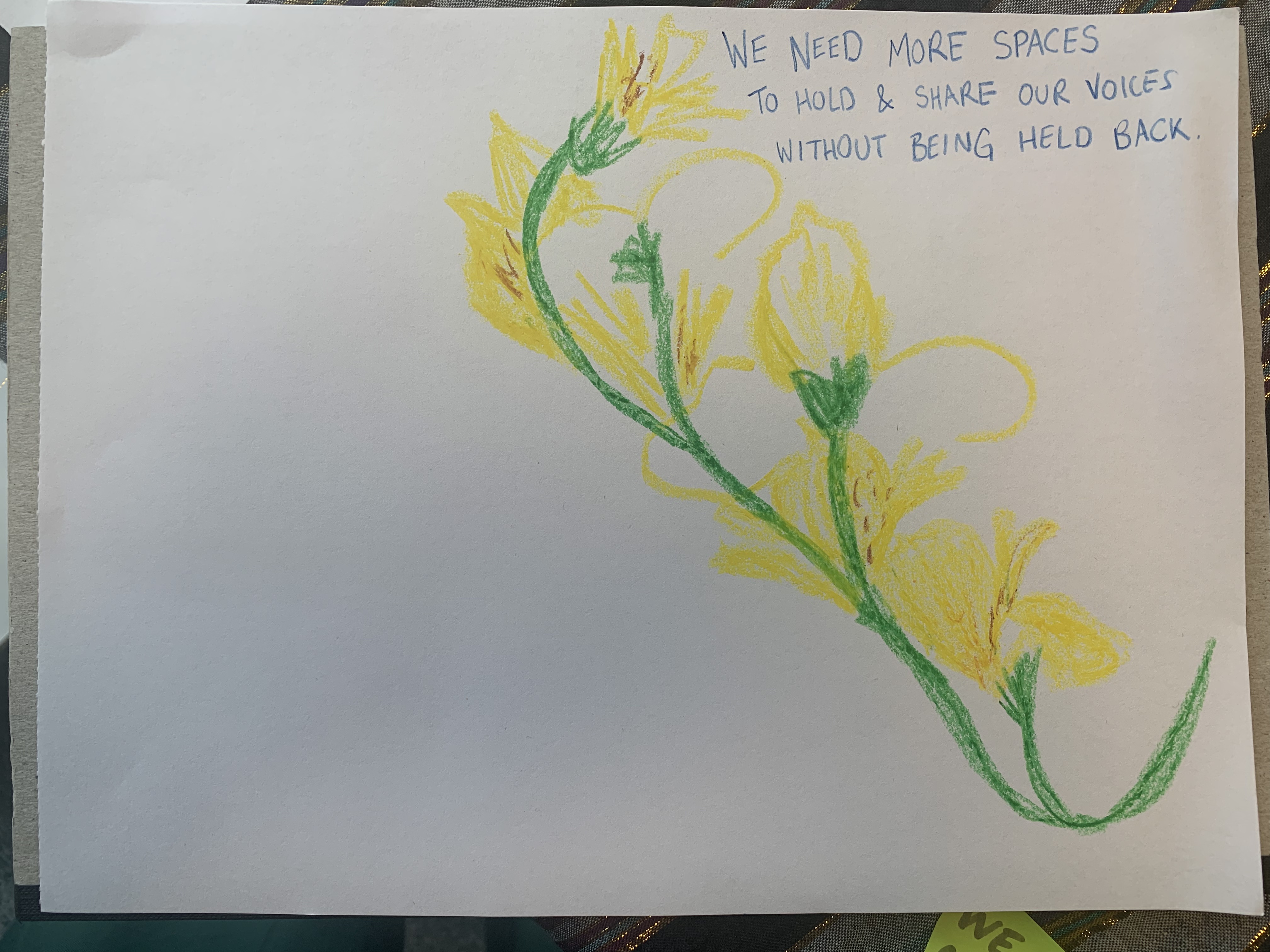 The creative practice is a key dimension of healing and generative engagement that the organisers seek to invoke in the exhibition space. The creative practice is multi-dimensional and includes a free-drawing space, an invitation to letter-writing in memory of Ibarra Colado, and textile crafting. The images above exhibit a small sample of the kinds of works that are produced by those who are inspired by the Recuerdos LAEMOS project.